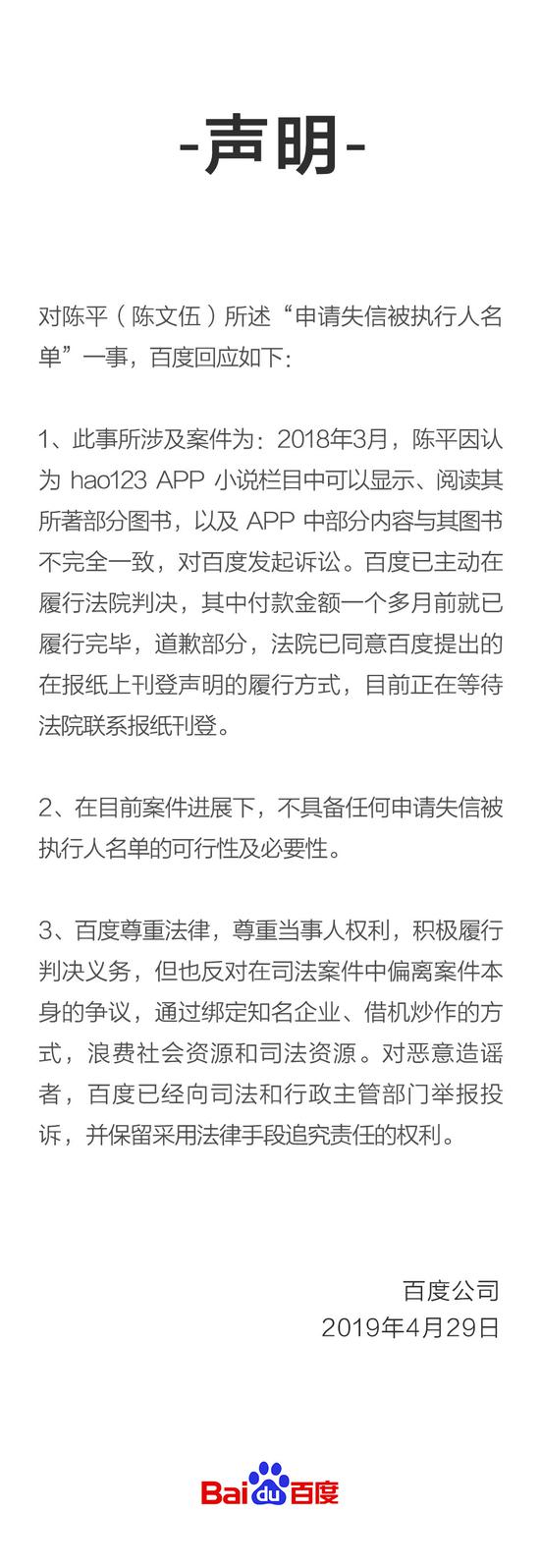 对陈平(陈文伍)所述“申请失信被执行人名 单”一事,百度回应如下: