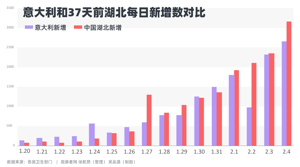 全球各地疫情爆发有先后之别,观察者网曾报道,意大利和湖北人口均为6000万人左右,前者疫情曲线高度类似37天前的湖北。昨日意大利新增病例数较前一日有明显反弹,升至2651例,疫情发展依旧类似早期的“湖北曲线”。
