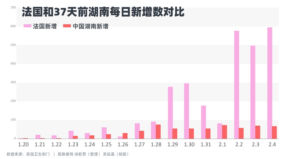 但对比发现,目前法国每日新增病例数,要远超37天前的湖南。
